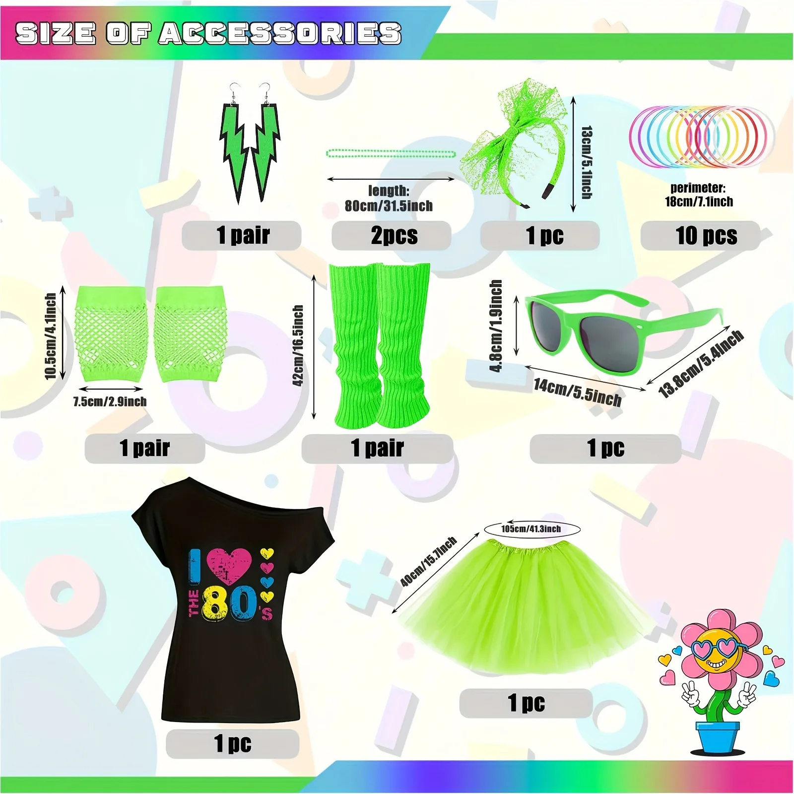 Ce costume comprend une tenue emblématique inspirée de la mode des années 80 : couleurs vives, style décontracté et accessoires flashy pour un effet “waouh” garanti sur la piste de danse. Léger et confortable, il est idéal pour bouger toute la nuit au rythme des hits cultes.